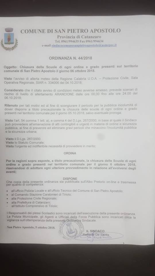 Vista l'allerta meteo diramata dalla Protezione Civile, le scuole di ogni ordine e grado dei Comuni di Cicala, San Pietro Apostolo, Gimigliano e Tiriolo rimarranno chiuse nella giornata di sabato 06 ottobre 2018.