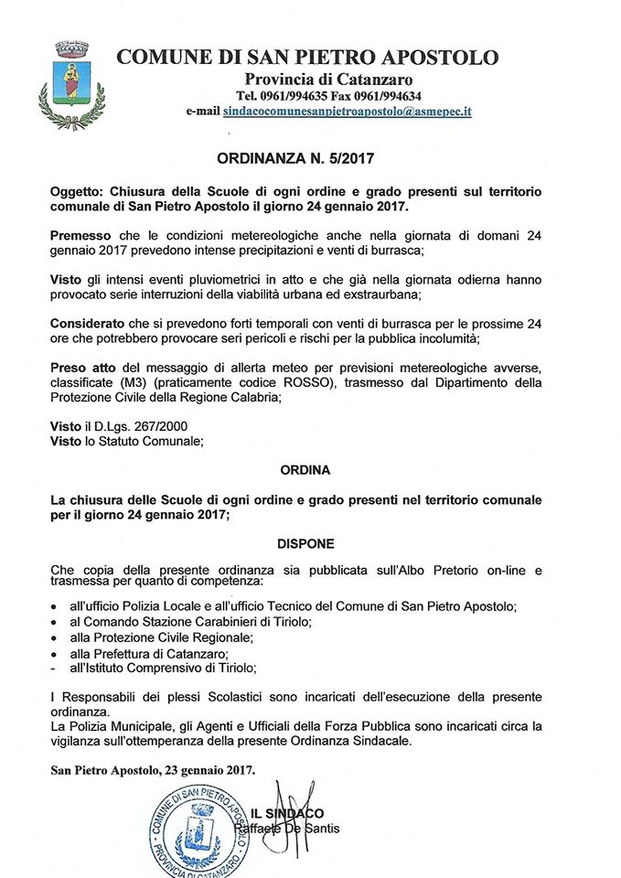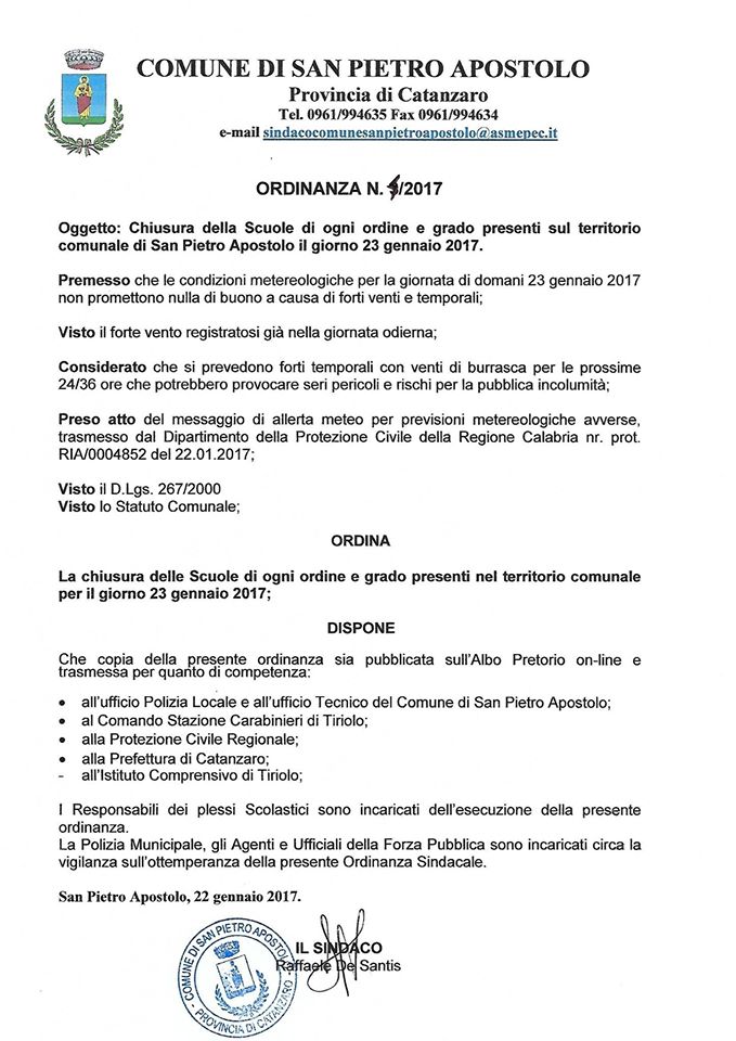 Visto l'allertamento meteo per eventi pluviometrici in atto, il Sindaco di San Pietro Apostolo ha disposto la chiusura di tutte le scuole di ogni ordine e grado anche per martedì 24 gennaio 2017.